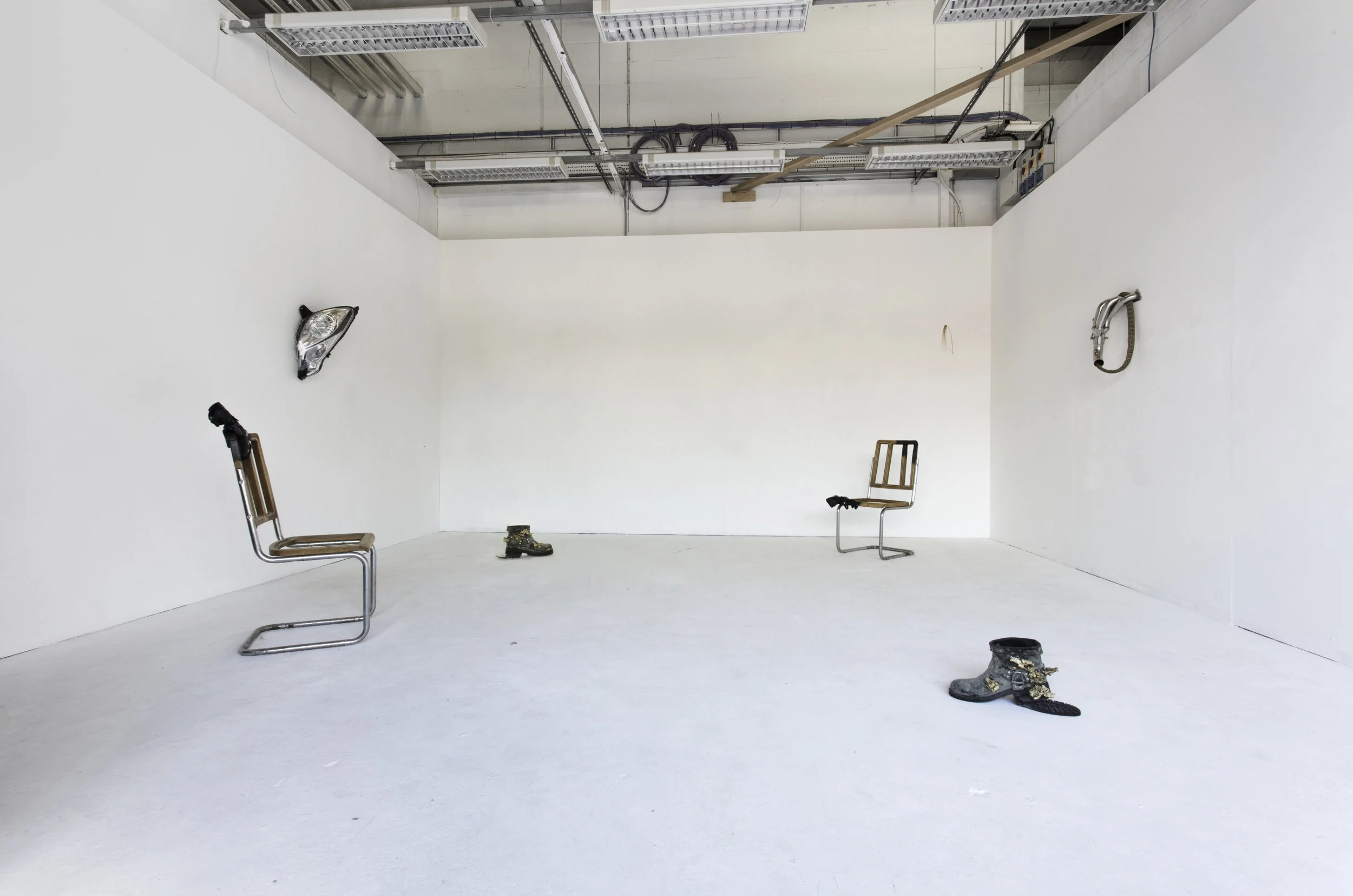 horns & regression of men artist's leather boots, mold, wood-ear mushrooms, found wing-mirror